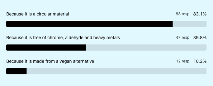 It sometimes feels like we have to persuade people that leather is the more sustainable option, over all those vegan alternatives. But we were curious to find out how Alcova visitors perceive leather in comparison to alternatives. 62% were very positive and intends to keep on working with leather. We like that outcome!